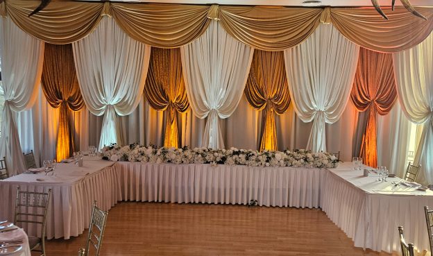 This type of backdrop works especially well for special occasions because it creates a beautiful setting for photographs and gives the room a strong central feature. At Wow Weddings, products such as the Flower Wall, Wedding Draping and Neon Signs all support this kind of layered styling.