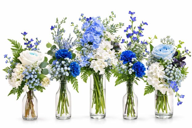 Intimate centrepieces in baby blue and spring tones