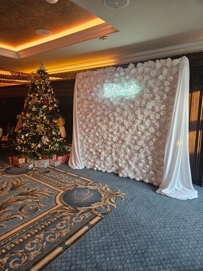 The ivory flower wall added a soft and romantic backdrop that suited the timeless style of Kilronan Castle perfectly. Its neutral tone worked seamlessly with the venue’s historic interiors while allowing the personalised neon sign to stand out. Positioned centrally, the display quickly became a favourite spot for guests throughout the day.
