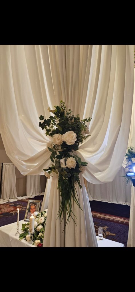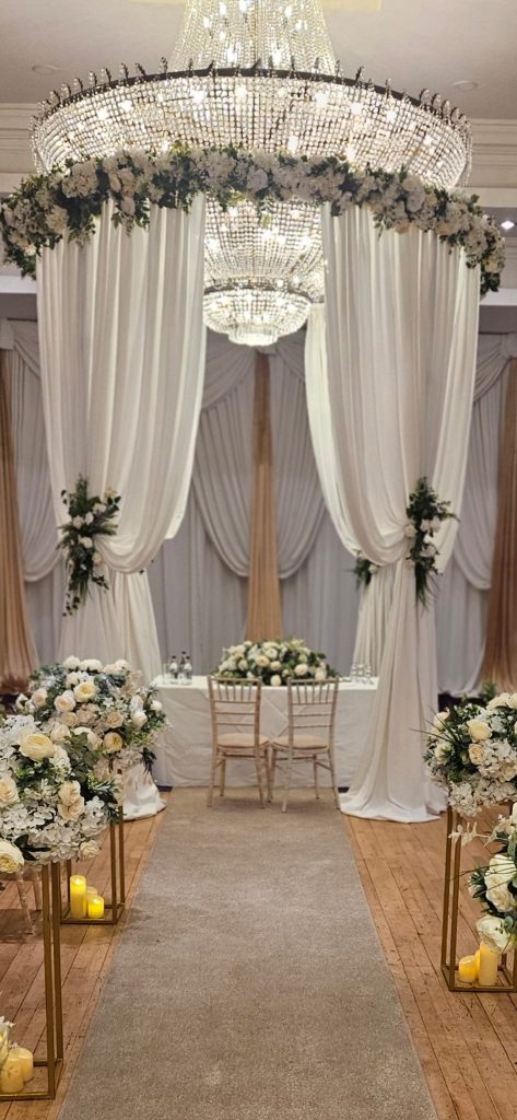 Next, we created a stunning fabric canopy with floral detailing above the ceremony area. This framed the top table beautifully and created a strong focal point for the couple. The soft fabric and fresh floral styling worked together to give the space a romantic and timeless look.