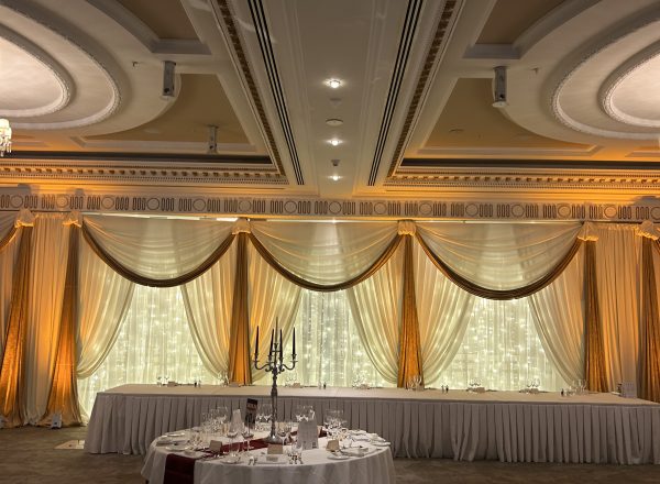The reception meal is arguably the best and most important part of your day, as friends and new family come together and break bread and share a drink to toast the bride and groom. In order to enhance this setting our stunning fairy light backdrops and matching top table and cake skirts that will pull the room together magically. Sit and enjoy your meal with family and friends as our beautiful backdrop and skirts create a majestic setting for you and your guest to enjoy. We specialise in back drops and draping and pride ourselves in transforming any room into something special for the day of your dreams.